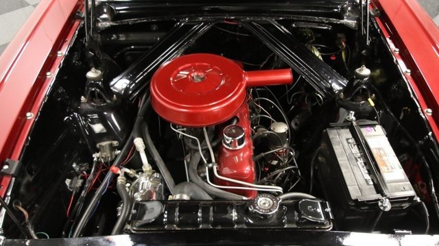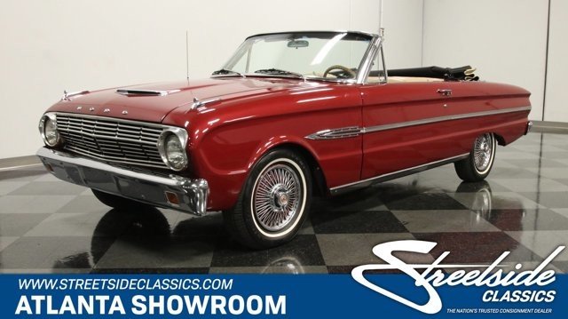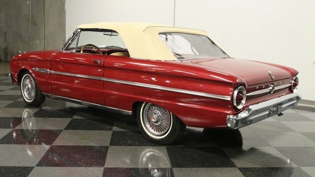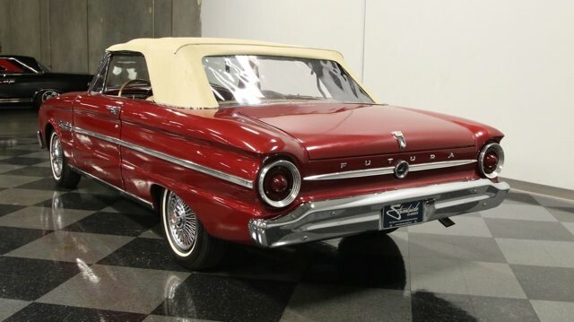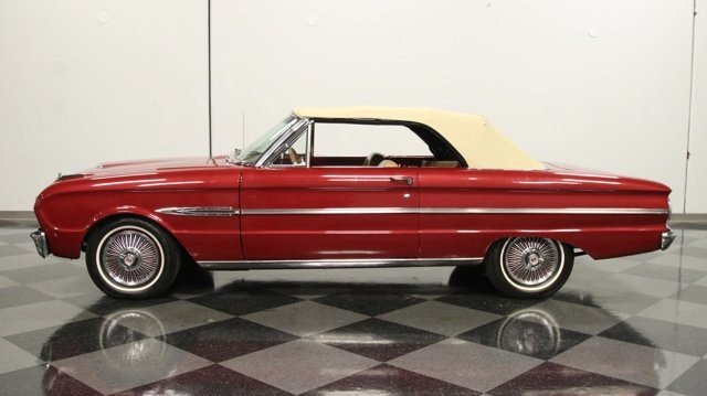 With a cool color combo, even cooler vintage droptop attitude, and cold-blowing air conditioning, this 1963 Ford Falcon Futura Convertible is a great classic worth plenty of attention. The maroon paint looks good on this convertible. The color is deeper than red to give you an added sophistication, and theres a metallic element that adds to the premium shine. The finish is a few years old, but it still looks quite attractive, especially when the sunshine is radiating off of this convertible. The tan folding top looks good, fits snugly, and is the kind of complementary color that adds to the alluring style. Plus, the brightwork is clean and complete in all the right places, including the hood scoop trim, full-width grille, dual ornaments, classy wire wheel covers, around the rocket-inspired tail lights, and on the arrow-like Futura side trim. There was even a more recent investment in re-chroming the bumpers to really get that classic American cruiser style right. While the tan top is stylish against the maroon paint, it powers down to reveal an even more comprehensive maroon and tan color theme inside. Its quite inviting with clean upholstery, newer carpeting, and a smooth dash. There are also terrific classic details everywhere from the bright trim to the AM radio thats there for display. And this is built to be a drivers classic with front bucket seats, a center console in-between, and an upgraded grippy woodgrain steering wheel. And since the upgraded R134a air conditioning is blowing nice and cold, you can enjoy top-down motoring long into the summer. The engine bay has quite an attractive style. The gloss-painted inner walls let the exterior-matching maroon metallic radiate on the valve cover and air grabber. This is Fords 200 cubic-inch motor. Its larger than the inline-six powerhouses offered in the Falcons first generation but the upgrade still fits nicely here. Its said to have