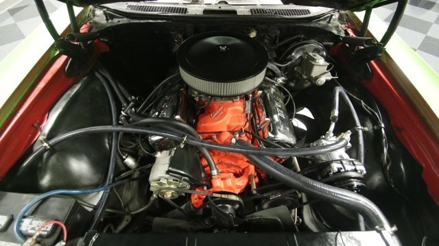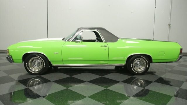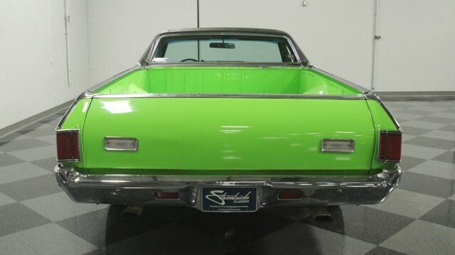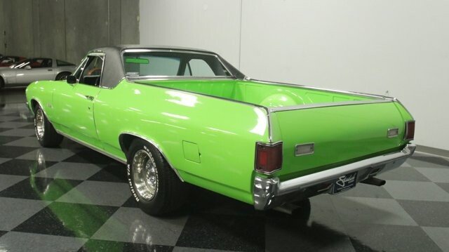 This 1971 Chevrolet El Camino SS 396 Tribute has striking paint, an A/C interior, and plenty of big block power under the hood. Its a package made for those who want a sharp-looking muscle car/truck thats made for driving. And everywhere you arrive, this one has an interesting story to tell. You know such a vibrant shade of green was not something that came directly from Chevrolet. The neon-like lime was a custom application for a Hidden Valley Ranch TV commercial. If that wasnt already interesting enough, were even told this was once owned by Blackberry Smokes Brit Turner! So this El Camino has distinction even before you notice the Super Sport upgrades like the cowl hood, hood pins, wide exhaust tips, SS badging, and white racing stripes on the hood. Plus, we love the look of the mean blackout grille and premium black vinyl top both tastefully contrasting the bright green. This is a good-looking classic complete with chrome bumpers and Rally wheels. But remember, the distinctive finish was done for TV and not car shows. So the level of scrutiny is different. Its also what helps make this big block classic such a carefree driver. Another part of a good driver is an inviting interior. It includes newer carpeting, a smooth dash pad, and a fresher seat with comfy cloth inserts. This was built to be comfortable with an AM/FM/CD stereo and cold-blowing R134a air conditioning. And because this wants to be a true drivers classic, there are nice added details, like the Chevy three-spoke sports steering wheel and cleanly installed auxiliary readouts under the dash. Its great to see the 396/402 cubic-inch big block filling the engine bay. And it has a nice style with the polished Moroso valve covers and bold orange block radiating within the dark inner walls. This V8 has the displacement for plenty of power, and it only gets better with upgrades like an Edelbrock four-barrel carburetor, Edelbrock Performer 2.0 intake, and headers feeding the dual exhaust and Thrush mufflers. More than just big power you can see there has