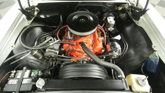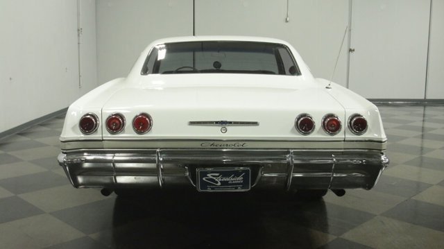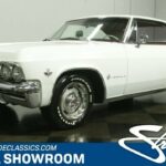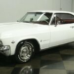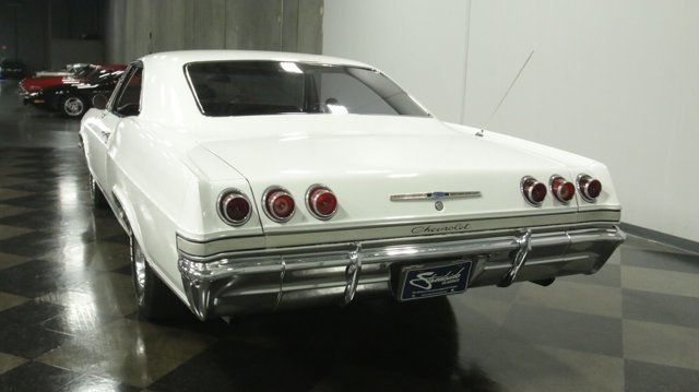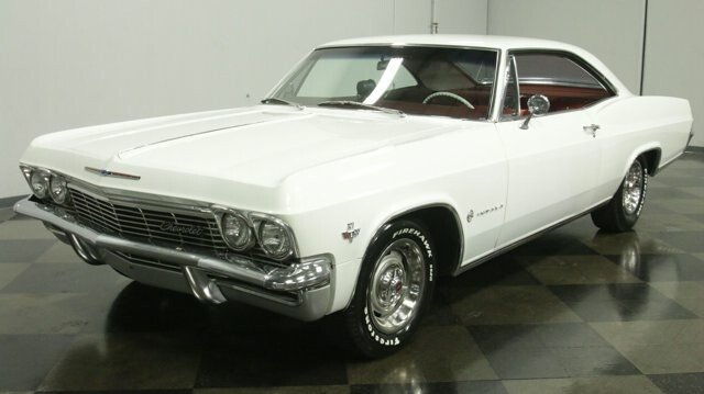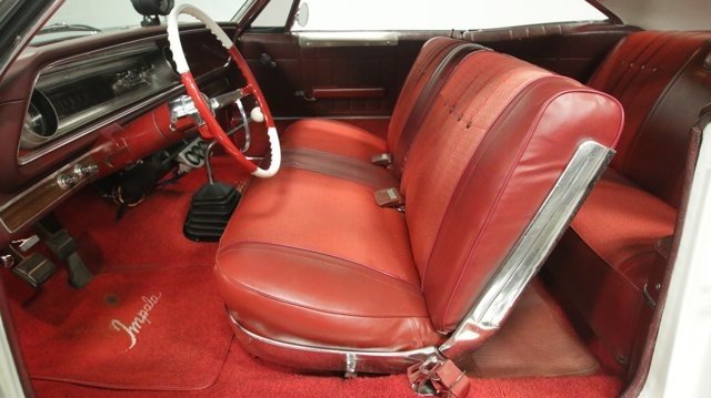 Chevys best-selling Impala got an all-new look in 1965, a bigger, bolder, sleeker car that was still unquestionably top-of-the-line. This subtle and restrained 1965 Chevrolet Impala offers a very appealing Ermine White-over-red look, 327 V8 power, a quick-shifting 4-speed gearbox, and a couple choice options that make this big cruiser a highly desirable piece of American machinery. You probably already know that some of our favorite cars are those that stand out for being different, and while this Impala is hardly radical, we like it every bit as much as its bright red and black siblings. It was born Code C Ermine White, so when it came time to restore this big coupe the builders wisely elected not to mess with the original recipe. The bright white shade is more subtle than the usual reds and blues we typically see on Impalas, but that doesnt mean it ever lacks attention. Its still an exciting color that is a perfect complement to the long, beautifully sculpted bodywork, and with all that real estate the car shines like a lighthouse beacon in our showroom. Its not a perfect show car, but it shows very well as a top driver-quality rig with almost no imperfections or touch-ups to speak of, and anyone that has any complaints should probably put there microscope away. Were not sure how old the restoration is, but its obviously fairly fresh, because the finish has a deep luster and bright glaze that only modern materials can boast. The sleek semi-fastback Impala shape looks good no matter what color you paint it, but in this shade this Imp has a subdued look that helps with the whole sleeper attitude. Bright chrome sets off the light paint rather well, and subtle Chevrolet and 327 emblems and Impala script show everyone that this isnt exactly Grandmas cruiser at the red light. From the outside, theres just no question that this is one of those amazing, stock-spec classic cars that has