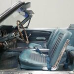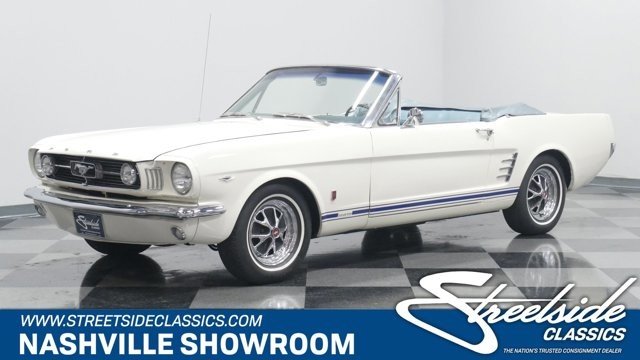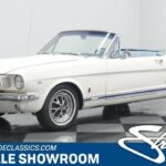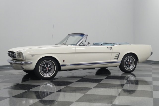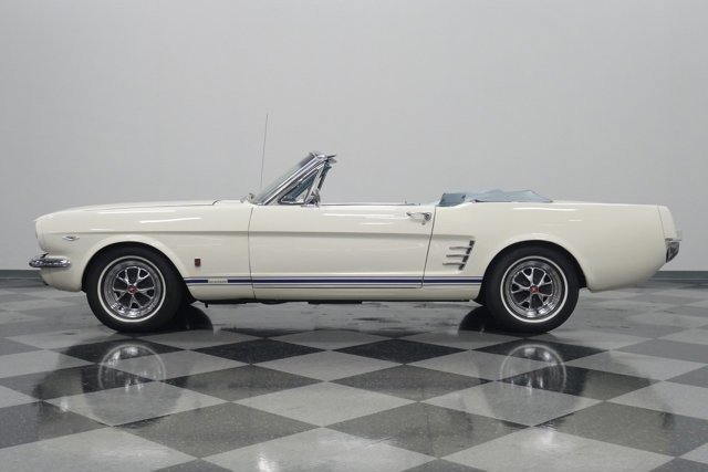 This 1966 Ford Mustang GT Tribute Convertible is a desirable A-code car with a terrific color combo, desirable features, and a well-kept vintage attitude – right down to the actual miles title. So as you dig deeper into the details, you really start to imagine how awesome this drop-top cruiser will be even on your first day driving it. Wimbledon White is always an excellent choice on an early Mustang. Its an iconic color from 1966 but was an upgrade here later in life. So it continues to have an attractive finish with a deep gloss that looks great in the sunshine. The white convertible top and whitewall tires pair quite well with the paint for a distinct look, but its that Shelby-style hint of blue that you probably like the most. The triple stripe on the rocker panels sits in-between the styled steel wheels to nicely contrast the white paint with sporty style. There are more GT details upgrades like the fog lights in the grille and dual exhaust pipes coming through the rear valence. Plus the chrome is bright, the stainless has