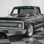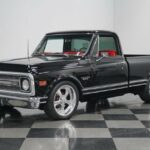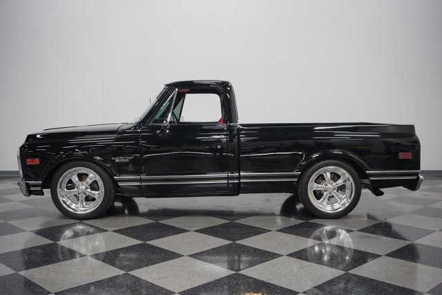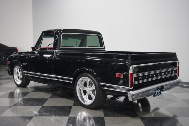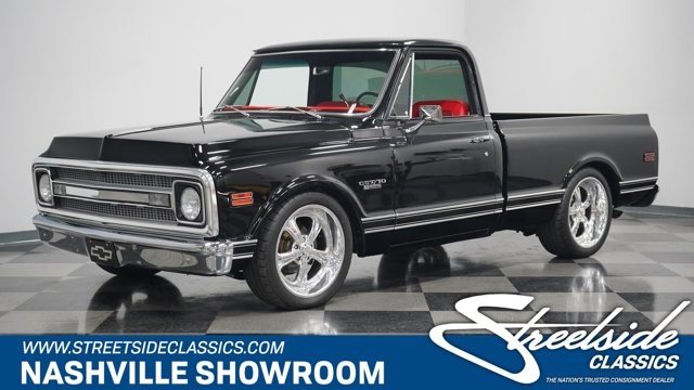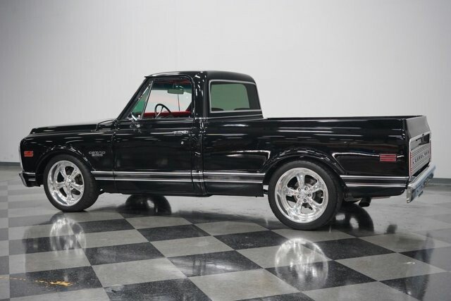 This 1969 Chevrolet C10 454 Restomod is quite the stunner, so much so that were fairly confident it might be the slickest Action Line C10 in our inventory. With only 262 miles on the full, nut-and-bolt restoration, its practically new in every way, punctuated by a super-slick Black paint job over a gorgeous red houndstooth interior. Its powered by a THUNDERING 454 V8 fuel-injected engine mated to a 700R4 overdrive automatic, sticks to the road thanks to a CPP pro-touring style suspension, and features a host of high-end goodies like 4-wheel disc brakes and cold A/C. Get out of the way, theres a new sheriff in town and hes stronger, faster, and prettier than all the ones that came before. As the 60s gave way to the 70s, Chevy embarked on a fairly extensive do-over of its highly respected line of pickups, giving them an exciting, modern appearance and attaching a new nickname – the Action Line. True to its models original intent, this 69 model seems prepared for vigorous activity – having the good fortune of professional builders that largely left its vintage look intact, while adding some killer extra touches in the mix that raise its curb appeal well above of its peers. It was purchased as an unfinished project already wearing recent high-end paint and bodywork, and in the past year it was completely sorted out, stuffed with high-end parts, and finished to the top-end driver-quality standard you see today. The modern Black paint was expertly applied, and because there are gallons of this deep, lustrous finish on the body thats barely seen the outside world, its bound to last for decades. By most accounts its a borderline show-quality truck with nary an imperfection to speak of (in fact, we only found a tiny dry spot on the passengers fender and a small smudge or two in the bed, thats it) and with only 262 miles on the completed restoration this C10 look incredibly fresh. A reproduction chrome front grille assembly was added up front to set the tone, a symmetrically creased hood protects the cackling monster underneath, and the original gas-cap on the cab was deleted when the tank was relocated to the bed. The glistening bumpers, shiny brightwork and hardware, and blacked-out Custom-spec trim that runs from end-to-end on the bottom of the truck and adorns the tailgate is all new to the build and its in excellent condition. Even all the glass is new also in borderline show-quality condition like the paint and because its all