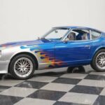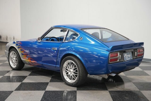 The 1976 Datsun 280Z may already be a legend, but this custom one will make you legendary. The flame-kissed exterior looks hot, and the custom A/C interior keeps you cool. But what youll love most of all is the Chevy 350ci V8 power upgrade under the hood. The first thing that grabs your attention is, of course, the paintwork. The front metallic gray is burning hot, and you see that as the yellow and orange are airbrushed into the flame. And we love how it all scorches against the metallic blue. Its a commanding full package, but this one is still built to be a driver you take out and enjoy. After all, if you love being a disruptor, youll just love making classic hot rods jealous with the finish on a Datsun. But thats far from the only custom touch. This has a sporty and sleek front end with a custom front bumper package that looks race-inspired. Theres a similar style out back where the bumper has