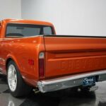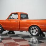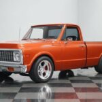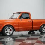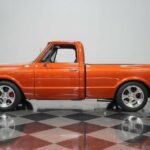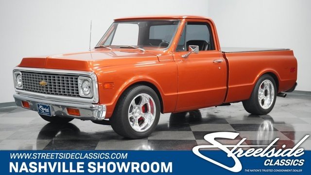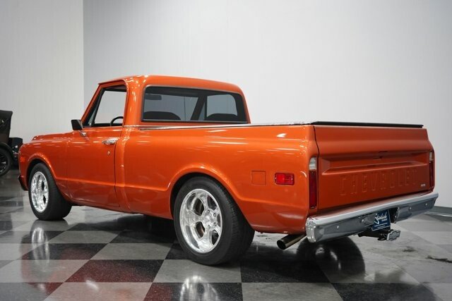 Take some time to check out all the custom details of this 1972 Chevrolet C10 Restomod. But dont linger too long, because with the slick paint, a custom leather interior, cold-blowing A/C interior, an overdrive transmission, four-wheel disc brakes, and an awesome 6.0-liter fuel-injected V8 under the hood, this truck will not be staying in our showroom very long. Atomic Orange is a modern color borrowed from a C6 Corvette, so it makes a distinct first impression. And since this is a full custom build, the paint even has some custom upgrading to give it added brilliance in the sunshine. The consignor is the builder, and he finished the restoration in 2013. You can tell this is a personal passion project by the way he sweated the details on the body by the smooth deleted badges and the proper fit of the panels that let the doors shut solid. Theres the right gleaming brightwork with the big chrome bumpers and trim around the grille. It gives you the right classic car shine without drowning out the polished performance upgrades like the side exhaust tips, crystal clear headlights, and 18-inch American Racing Custom Shop two-piece wheels. The black tonneau cover continues the sporty style as it tightly fits over the bed for a nice aerodynamic upgrade. And underneath is liner paint so that you can both show this custom C10 off and pull real truck duty when you want. And if this truck needs to do some dirty work, its easy to hook up a trailer to the Class 5 hitch. There are even adjustable airbags on the rear suspension to properly take on a load. The bright orange returns inside as an accent color, and now its joined by black. The seating is borrowed from a Ram, but its fine to have a Mopar in a Chevy when you have plush leather bucket seats. Theres a jump seat in the middle, but youll just like it better for folding down to give you a center console. Everything right down to the rubber mat floor looks crisp and clean – exactly what youd expect on a well-done build. There are more worthwhile upgrades like a retro sound AM/FM stereo w/Bluetooth, full stereo speakers with subwoofer, shoulder seatbelts, and cold-blowing air conditioning. This is also built to be a better driver. Thats why you have a sports steering wheel, power steering, and beyond that is a full set of Dakota Digital HDX gauges. The engine bay continues this trucks custom attitude with a smooth and clean style that really knows how to put this modern motor on display. This is an LS-based LQ4 6.0-liter Vortec motor, and the fuel-injected V8 upgrade means more power and consistency wrapped in a tidy-looking package. It was built with the right upgrades, including a Volant cold air intake and a factory big block 4 core radiator with electric fans. Plus, this mighty V8 exhales with added power and rumble as Sanderson ceramic-coated headers feed the H-pipe dual exhaust and Dynomax mufflers. The 4L80E four-speed automatic transmission was built to pair with this motor, and this has