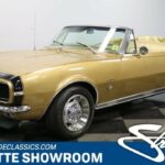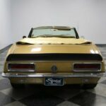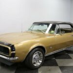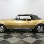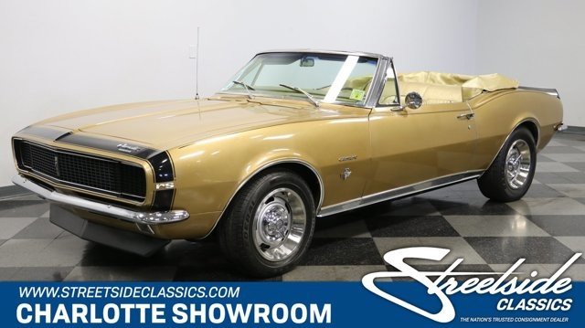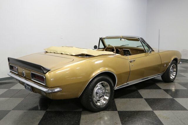 This 1967 Chevrolet Camaro RS Convertible is a great cruising classic. It has its sophisticated color combo, plenty of well-preserved details, and the right upgrades to be a good driver. It all makes for the kind of style you want on a real-deal Rally Sport. The trim tag tells us it was born a Granada Gold drop-top. A later respray gave it some added metallic flake that lets this sunshine-friendly convertible look even more radiant out in the sunlight. Black always looks terrific against, and so they gave this a comprehensive dark side with the D91 sports stripe, chin spoiler, rear spoiler, pinstriping, and a crisp-looking convertible top. And of course, this is a real-deal Rally Sport, so you get the blackout style of the hidden headlight front end. Overall, the presentation and finish of this RS is about being a driver-quality and driver-ready car. Thats why youll pick up on little details like the larger 15-inch Rally wheels that allow you a better selection of modern tires. And good body lines, bright bumpers, and complete trim give this the kind of total style that will certainly get you some long stares when this pulls up to the stoplights. As nice as the black roof looks against the gold paint, the look of the gold interior against the gold exterior is quite premium and distinctive. So youll love folding back the top to show off the full package. A quality style on the seats, carpet, and dash pad make this inviting, and its so comprehensive that you have golden details like the convertible boot. Because this is built to be a cruiser, you have all the right driver-ready features. This includes factory-style details like the front bucket seats and the center console with a clock. There are also worthwhile upgrades like a cup holder/armrest console and a retro-style AM/FM stereo. Powering this Camaro is a year-correct 327 cubic-inch V8. It looks quite nice with the bold orange block, shining valve covers, matching air grabber, and an overall tidy style. The V8 has