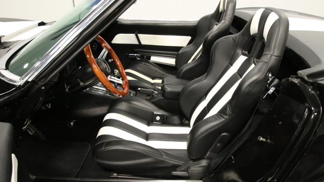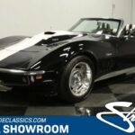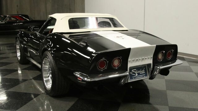 This 1969 Chevrolet Corvette Convertible radiates a truly mean style, and its not just because of the custom bodywork. You have a performance-built fuel-injected 496ci big block, the control of a five-speed, and a freshly upgraded suspension. It all makes for a car thats attractively coordinated, exceptionally sharp on the streets, and awesomely powerful from the moment you even think about touching the accelerator. Black with a white racing stripe is an awesome way to show off a speedy Stingray. It showcases both a high-contrast and high-performance attitude. And as you dig into the details, youll see this is a convertible that loves to be driven. So it likes to look good out on the streets without making you nervous about enjoying it. And there are plenty of well-integrated details that showcase this cars powerful style, like the custom chin spoiler and classic-looking Rally wheels that are actually larger/modern 17-inch units. And we especially love the hood. It takes the already impressive L88-style and adds an air scoop on top! But more than just a powerful presence, theres also just a pleasant amount of classic style. You see it in nice chrome bumpers, full polished rockers, and the white roof that coordinates with the cars white stripe. When you take the roof down, you can see that more of the attractive black and white style continues inside. So you have a convertible thats thoughtfully coordinated with the top up or down. The full presentation is a nice mix of style, comfort, and performance in a driver-quality package. Youll see nice updates everywhere from the good carpeting to the AM/FM stereo with Bluetooth. But the real focus here is about being a drivers machine. After all, the upgraded two-tone seats look cool, but their real purpose is to give you terrific bolstering. You also have an upgraded sports steering wheel on a tilt column, the Stingrays excellent full gauges package, and a bright shifter with an extra gear on the pattern that the factory never offered. The engine bay is filled with awesome-looking power. Its a 454 cubic-inch big black that is said to be enlarged to 496ci total. More than just a monster displacement you have nice features like an Edelbrock Performer RPM intake, a thick aluminum radiator, an upgraded ignition system, and a header-fed dual exhaust. It has even