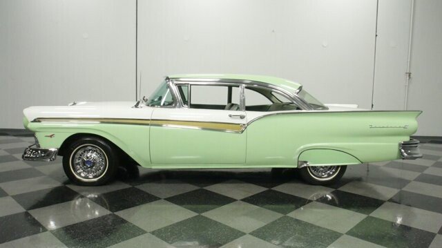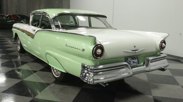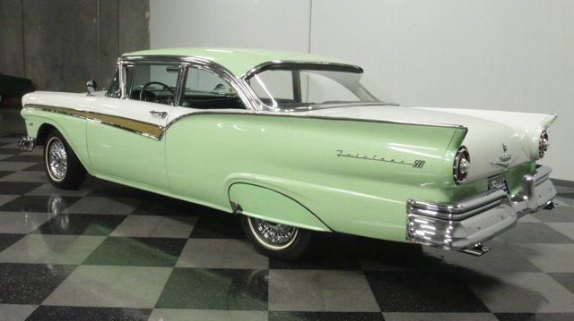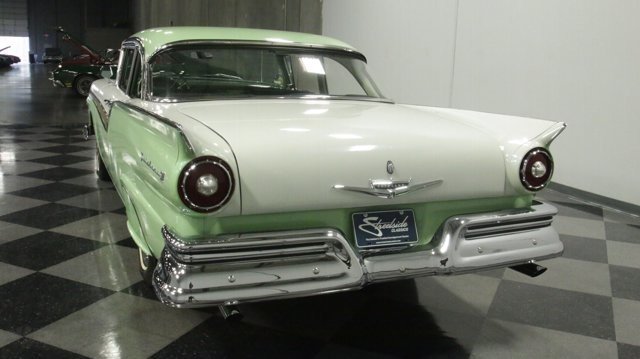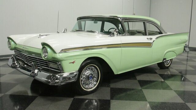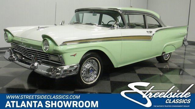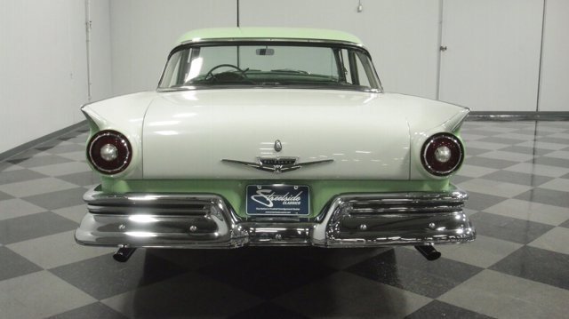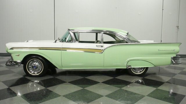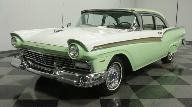 Are you going to love this 1957 Ford Fairlane Club Sedan for its classic two-tone style? Its A/C interior? Or the shining triple deuce setup in the tidy V8? We know the answer to it all is YES! This car has the look of a cherished classic, and thats because it is one. The gentleman who prized this Ford loved to make sure it had plenty of radiance. So you now only have a bright shine off the chrome, but the Colonial White paint has a nice hint of pearl. The Willow Green lower section not only completes a great period-correct two-tone, but the trim tag also tells us its factory correct. It all has the kind of smooth feel that lets you know there was extra pride in this cars care. We love the 57 Fords because there were some terrific styling elements, like the headlights that look frenched and the full-length side trim with a gold streak. And theres plenty of true cruiser style with the rear fender skirts, wire wheel covers, whitewalls, and dual exhaust tips. The interior is a terrifically vintage sea of green. As Fords full-sized offering, theres plenty of room to take family and friends along for the ride. And youll appreciate details like the comfy cloth inserts of the seats and seatbelts. Nice carpeting, a smooth dash, and coordinated door panels give this a thoughtful style. Even the dome light is working. This classic wants to be driven, and so you have the right well-placed upgrades, including a water temp gauge and classic-style air conditioning system both under the dash. The engine bay has a tidy look and glossy-painted inner fenders that allow you to show off the motor. And when you pop the hood at the car shows, people will really take note of the three polished air filters. They are the unmistakable look of a triple set of dual-barrel carburetors. In fact, this triple deuce setup was just rebuilt as part of a larger recent servicing. The Thunderbird Special valve covers give a great classic look to this 292 cubic-inch V8. But the electronic fuel pump, upgraded coil, and polished alternator are also reminders that this has