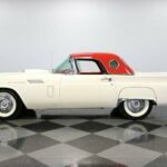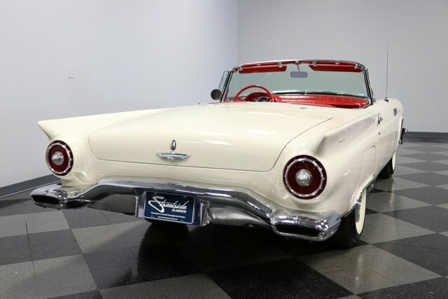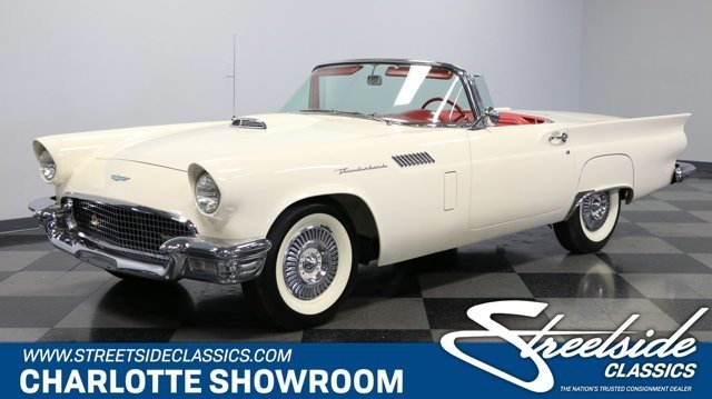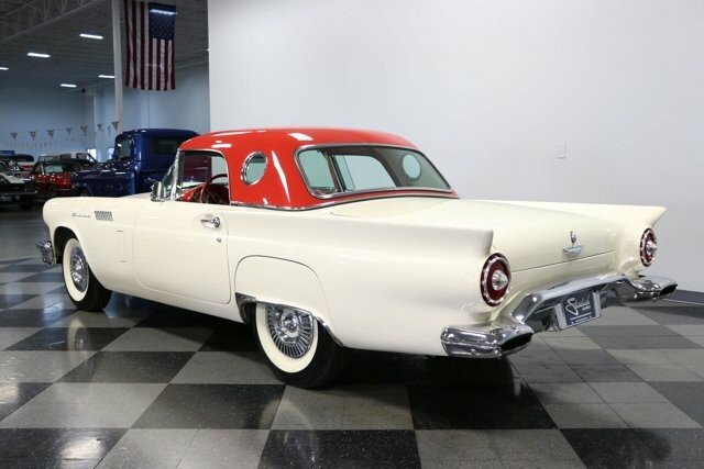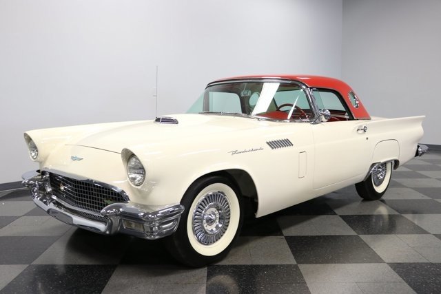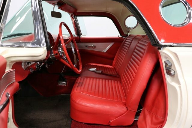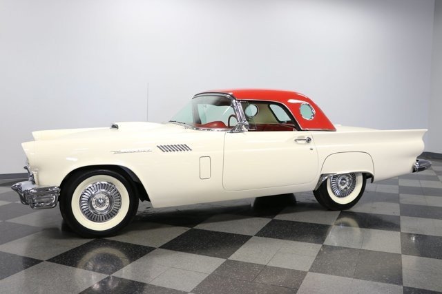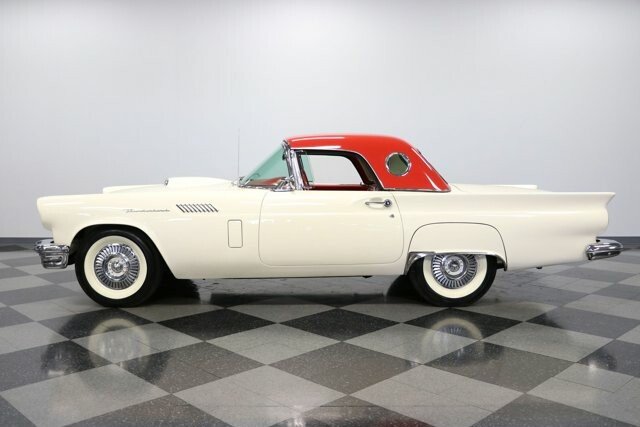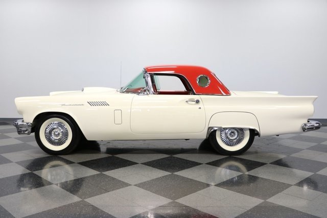A 1957 Ford Thunderbird with a cruiser-ready color combo is a true standard in classic elegance. So it would be one of the last ones out there that people would think could also blow their doors off everyone else. Thats the beauty of being a rare E-code car with the correct 312ci V8 with dual-quad carbs under the hood! Colonial White and wide whitewall tires are a very sophisticated way to arrive anywhere. But this is also a hot E-Bird, so the red pothole hardtop adds spiciness to its elegance. So yes, this car gets noticed for more than just its rare power package. Plus, theres a terrific shine to all that iconic bright work. It starts with the large grille cradled by the 1957 cars exclusive smoother and contoured bumper. Theres intricate bright trim around the windshield, rear fender skirt, and hardtop. All this chrome ends in the bold jet-inspired rear with a bumper so integral that the exhaust exits through its corners. It has a great cruiser style because, after all, a dual-quad T-Bird was made for driving. You will need to put some additional work into it if you want to upgrade from a car show to concours. But considering 1957 is often the most sought-after year, its believed less than 1,500 ultra-desirable E-Birds were ever made. The constant demand always seems to justify any level of investment. Since the red hardtop looks so distinct, were especially glad you can remove it and have a full red interior. There are nice features like plush carpeting, power windows, a grippy color-matched steering wheel, and side wind wings, and the dash light greets you when you open the door. Its such a vintage feeling that even the AM radio is there for display. Plus, Thunderbird fans always love to see the premium Dial O Matic seat. It lets you know that a memory power seat isnt just something you find in a modern Mercedes! We especially like the 57 T-Bird because of the sporty feeling of the layout. The machine-turned dash was always a nice feature, and this year also got a revised gauge layout that put everything right in front, including the handy tach. Since the engine makes for such a desirable classic, this one ensures its ready to be displayed on day one. Everything is in place, from the premium Thunderbird valve covers to the correct washer fluid bag. So you can tell it has