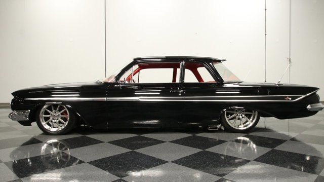 Sleek paint, a custom A/C interior, an adjustable air ride suspension, four-wheel disc brakes, and an awesome LS V8 under the hood – this 1961 Chevrolet Biscayne is a stunning full custom restomod thats so unique and detailed that it cannot escape the spotlight. You already know why the 1961 Biscayne is such a cool ride. There were some nice touches that did not make it onto any other year, and so they are sought after by collectors today. There was a curved windshield in the front, and the wraparound rear glass gave you a sporty roof overhang. Plus, theres the absolutely awesome stylized sheet metal where the profile has a design line that wraps around the rear and creates the dipping V in the rear panel. You see this element so well because of the clean/bright Impala-level trim against the dark black paint. And as you start to look over these stylish pieces you can really see the full investment in this Biscayne. Theres less than 500 miles on the full build, and it was completed only a couple of years ago. So the full package looks good with only minimal signs of age and use. That means a nice luster from the deep black, attractive sheet metal, and an overall attention to detail. This was built to be a proper restomod that straddles the line between vintage and new. So you have cool classic custom pieces like the dual aerials and seamless chrome bumpers. These are joined by more modern upgrades, like the wide side exhaust tips and the REV alloys with a 17/20-inch front/rear stance for a sporty look. And speaking of stance, the custom full air ride suspension lets you dial-in the ideal low look you want when youre taking a slow ride through the cars & coffee parking lot. Theres just something extra attractive about a black car with a red interior. This is a fresh and full custom setup, but you can tell they took the time to give this a full vintage vibe. The red/black weave carpeting, textured cloth inserts in the upholstery, and button-top setbacks that are repeated in the doors are all pure classic cool. The upgrades are well integrated. For example, you keep the air ride controller between the front seats or hide it under them. The radio is a retro-style unit that has a USB connection in the glovebox so that you can plug in your phone while still being incognito. And the modern R134a air conditioning system uses factory-style controls and vents mounded under the dash. A true restomod also likes to be a proper driver. Thats why you have front bucket seats, a classic sports steering wheel, a tilt column, and hydroboost power steering. Plus, we love the way the upgraded Dakota Digital gauges red glow coordinates with the full interior – it shows the added thoughtfulness to the full package. As much as youll love showing off the interior and exterior, its the motor that will really draw all the crowds. Under the hood is a modern 6.0-liter fuel-injected V8. It looks absolutely devilish with the full black presentation thats only broken up by the occasional red or polished component. But while the appearance is a bit evil, the overall impression is quite nice. Its built to be a proper cruiser, and you see that with features like the dignified tune of the dual exhaust, and the aluminum radiator with an electric fan that helps keep this running cool even when youre in traffic. Plus, the four-speed automatic transmission gives you highway-friendly overdrive. This is also meant to be a sharper driver with upgrades like tubular front A-arms, a Hotchkis front sway bar, Spohn Performance rear trailing arms, Wilwood four-wheel power disc brakes, and a 9-inch limited-slip rear end with versatile 3.73 gears. This is a distinct-year Chevy that has