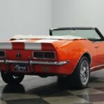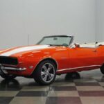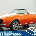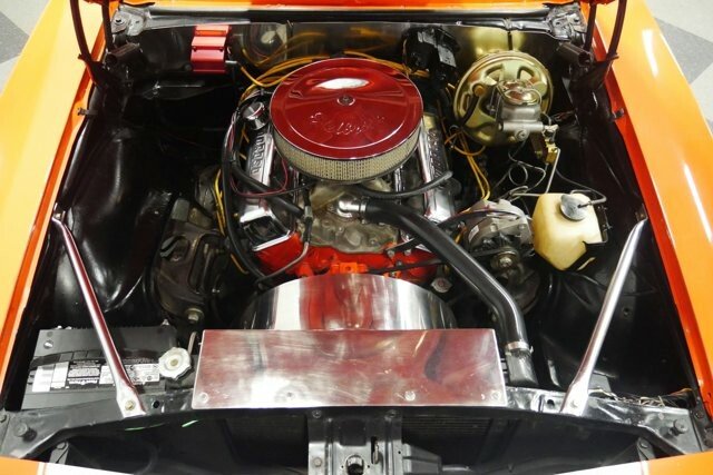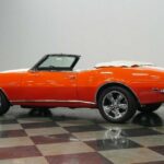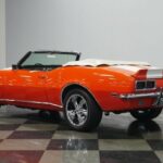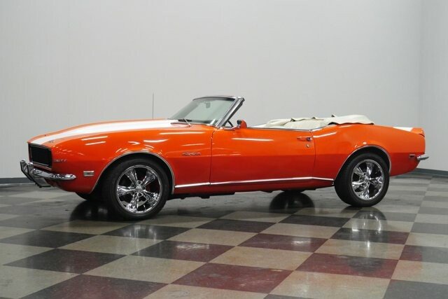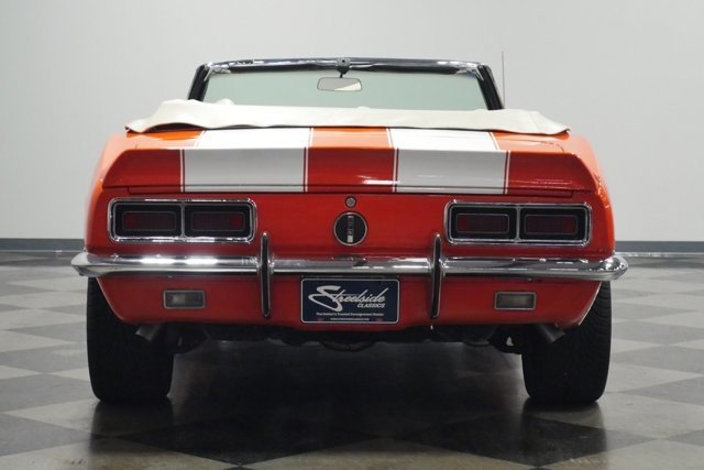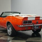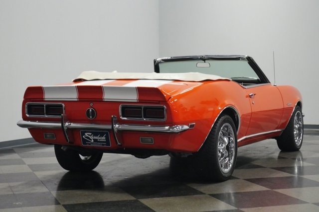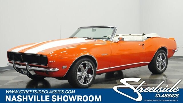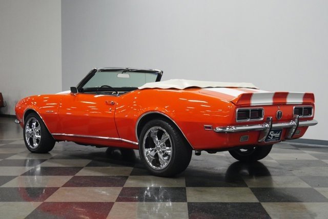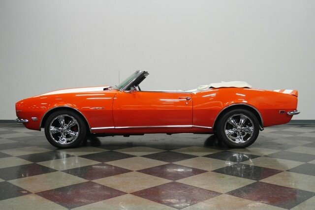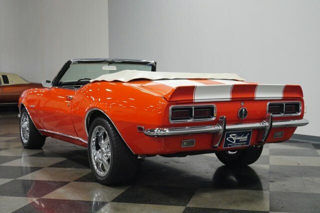 This 1968 Chevrolet Camaro RS tribute convertible has the bright and coordinated look of quite a fun car. And as you look at the total package, you can tell it was made to be enjoyed. After all, with an enhanced V8, overdrive transmission, and four-wheel disc brakes, its the classic hidden headlight drop-top youre going to take on road trips near and far. Hugger Orange is an aggressive color that is always perfect on these first-gen Camaros. The paint has a good gloss that shows off an attractive shine every time you take this convertible out for a sunny day cruise – exactly what you want in a sunshine-friendly drop-top. Its part of a package where chrome bumpers and trim have good shine, lines are straight, and doors shut solidly. With the white racing stripes painted on, it makes for an attractive coordination with the convertible top. So this one really does know how to command attention from blocks away. Its part of an overall theme that looks great without getting too fancy that youll be afraid to drive it. After all, those 17-inch Foose wheels not only add to the shine, but they also let you upgrade to your favorite set of modern sport tires. And speaking of sporty, this has desirable features for the first-gen Camaro, like the D80 rear spoiler and tall cowl hood. And of course, the upgrade to the Rally Sport hidden headlight front end makes this absolutely iconic. The white interior gives you the same appeal as the exterior accents, so this one has a nice color combo with the top up or down. The clean look of the door panels, dash, seats, and trim make this feel like a well-respected machine. And it also has the right details like a matching convertible boot and under-dash courtesy lights that greet you when the door opens. Bucket front seats with a center console in-between make for an inviting drivers atmosphere. There are the right classic pieces, like the horseshoe shifter and a grippy RS steering wheel. Plus, there are well-integrated upgrades, like the SunPro aux gauges and the retro-style AM/FM digital tuner with an iPod input and upgraded speakers. So it all makes for a classic thats ready to cruise. Under the hood is a 327 cubic-inch V8. The clean and tidy setup, and there are good fundamentals like new hoses, belts, and wires that tell you this has