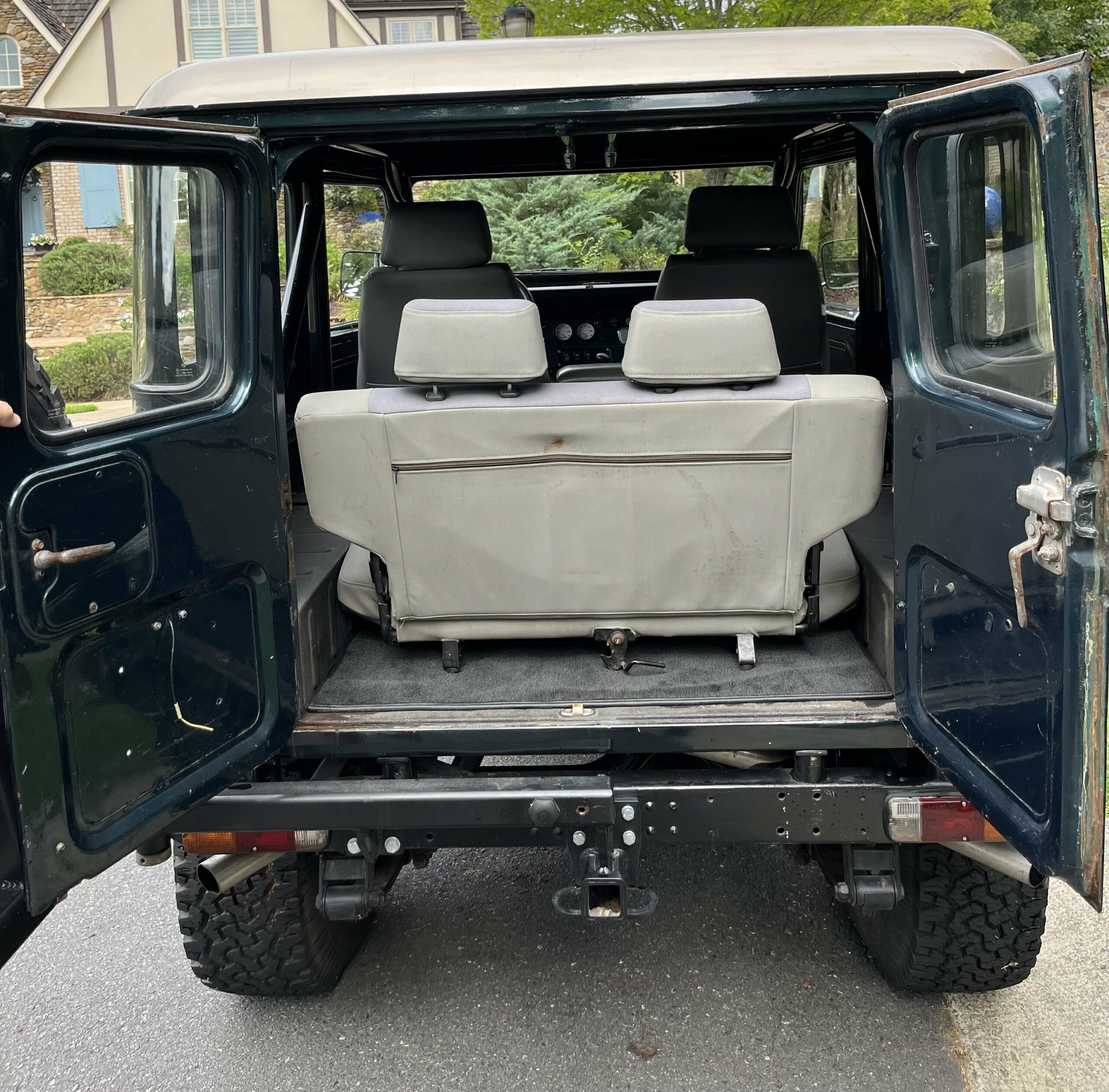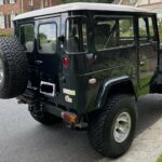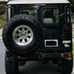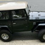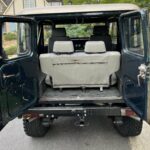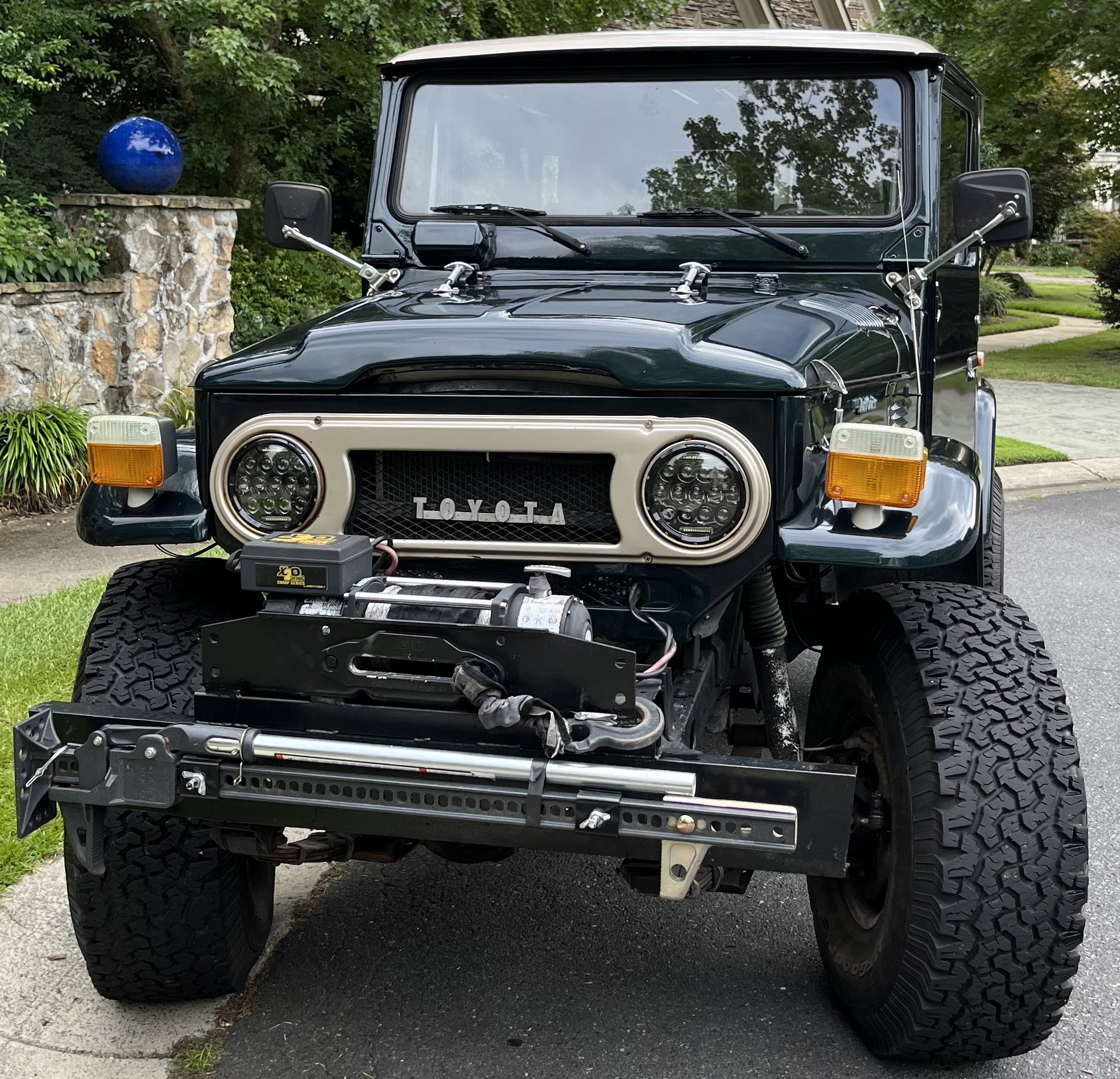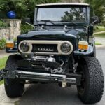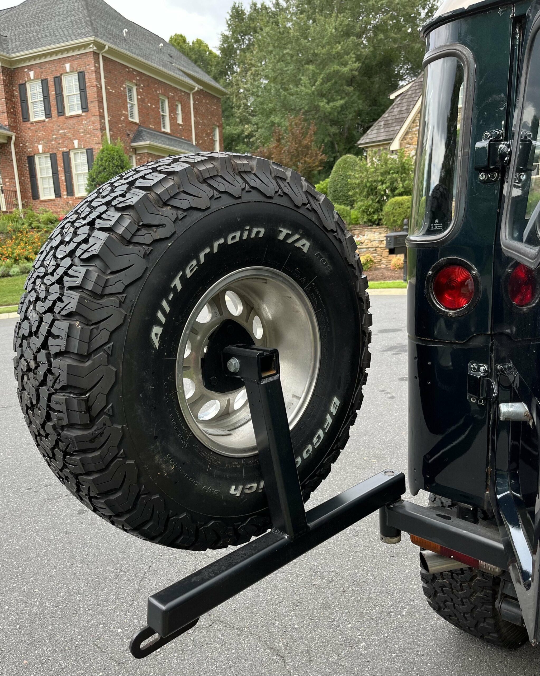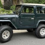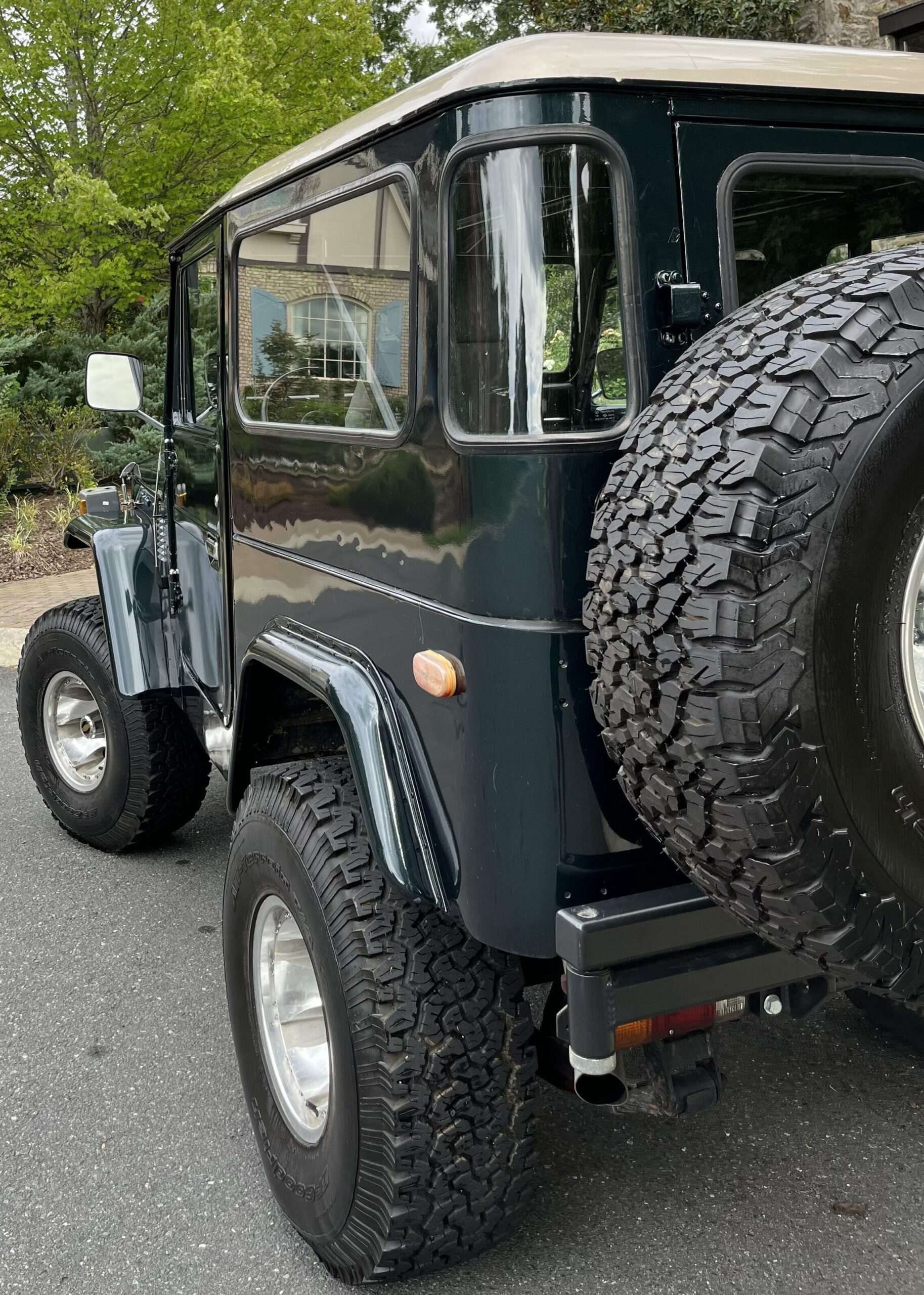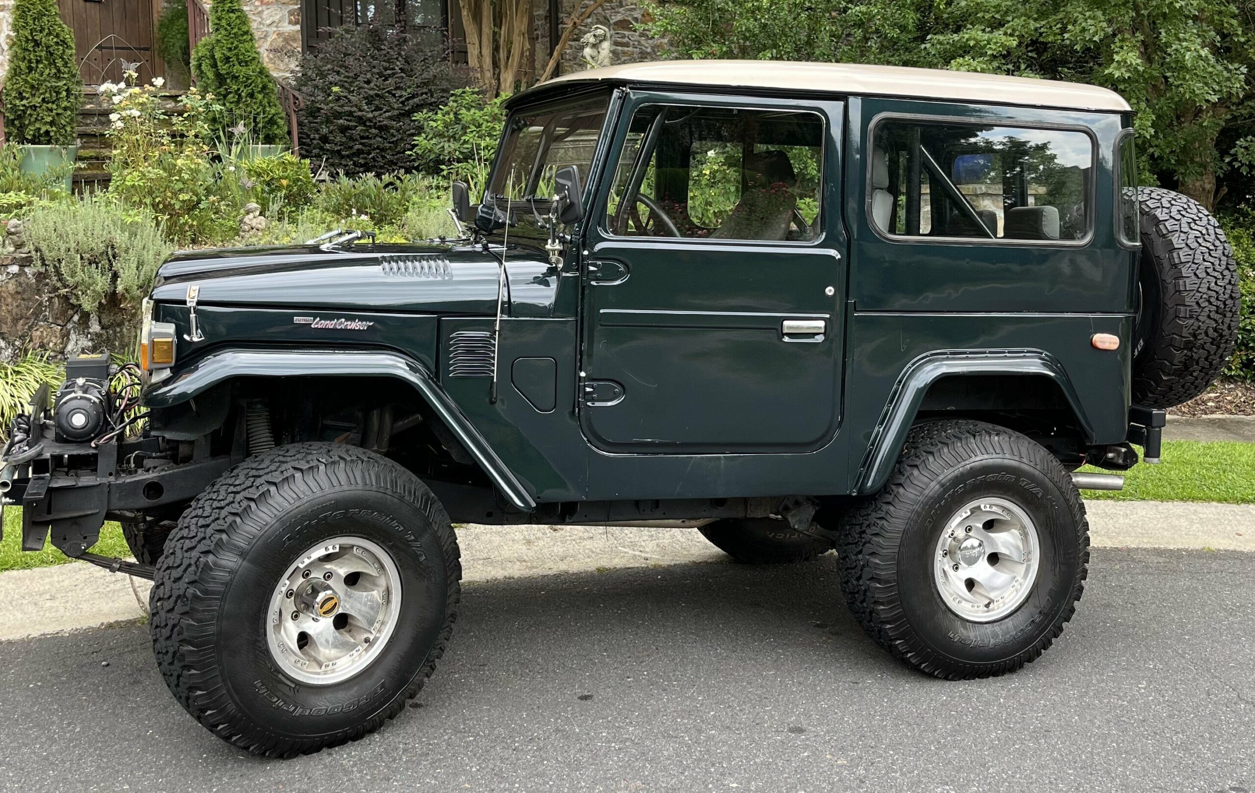 1976 Toyota Land Cruiser FJ 40. Exterior The exterior forest green paint job is truly one of kind and will catch the eye of any passerby. The roof is finished with a champagne gold color creating a unique, tasteful look. This FJ has plenty of clearance for your off-roading adventures with a 3-inch body lift, 15-inch wheels with Warn hubs on the fronts, all wrapped in 35×12.50R15 all-terrain tires. An exterior mounted spare tire hangs off the back gate. The front bumper sports a 10,000-pound capacity Comp Series electric winch, along with a trail jack. The iconic oval grille on cream color is now fitted with LED headlights for those nighttime off-roading adventures on the trails. Drivetrain A non-original crate 350ci V8 fits nicely into the engine bay. Held on by an Advance adapter block that mates the engine to the H42 4-speed manual twin stick transmission, this recently rebuilt transfer case and transmission (less than 100 miles ago) disperses power to all 4’s. This FJ40 is also custom fitted with an overdrive allowing for a smoother driving experience at highway speeds. Interior Utilitarian but effective with gray vinyl big buckets up front and show in fair condition with some rips in the seam areas. A cloth smaller aftermarket rear seat is seen while Custom carpeting in the floorboard almost makes you forget this vehicle was built to climb mountains. The cab is fitted with a custom-fitted roll cage. The original dash has a handmade insert with Autometer Gauges. The vehicle is custom fitted with ARB air lockers that allow you to switch from open differential to fully locked in a matter of seconds. No need to step out to lock the differential on the hubs; With a click of a button, you can be ready to climb any obstacle that stands in your way. The center of the dash also has Autometer gauges inserted, as well as many original knobs and chromed glovebox. An AM/FM/CD player also hangs below the dash along with a rally style steering wheel. There is a bikini top and soft door that come with this truck, as well as a body matching hard top (seen in photos). A full oil change has